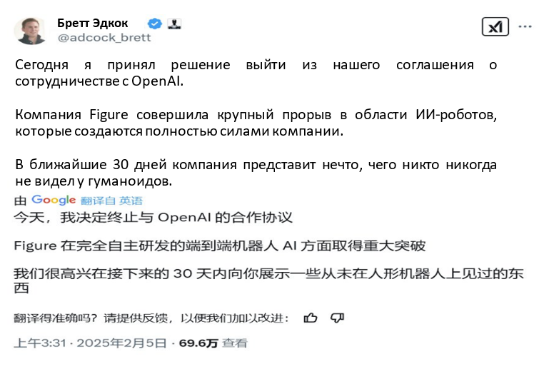 5 ақпанда Figure гуманоидты роботтарын шығаратын жетекші компанияның негізін қалаушы және бас директоры Бретт Эдкок OpenAI-мен ынтымақтастықтың тоқтатылғанын жариялады. Бұл қадам компанияның негізгі шешімдерді қабылдаудағы тәуелсіздігін, сондай-ақ экономикалық тиімділік пен технологиялық прогреске тікелей әсер ететін өзгермелі жағдайларға жылдам бейімделуін көрсетеді. Кездейсоқ сәйкестік бойынша, 2025 жылдың басында DeepSeek атты жаңа жасанды интеллект компаниясы оқытудағы инновациялық және арзан технологиясымен назар аудартып, жаңа инновациялар толқынын туындатты.